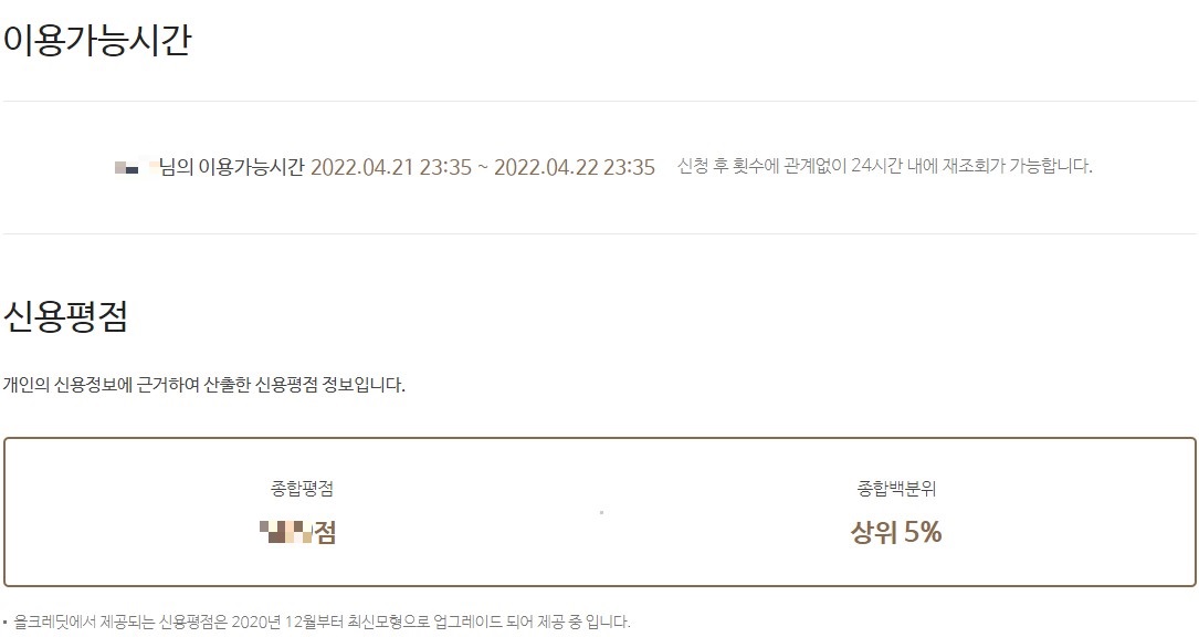 신용평점 및 종합백분위가 나타납니다. 24시간내 재조회가 가능합니다.